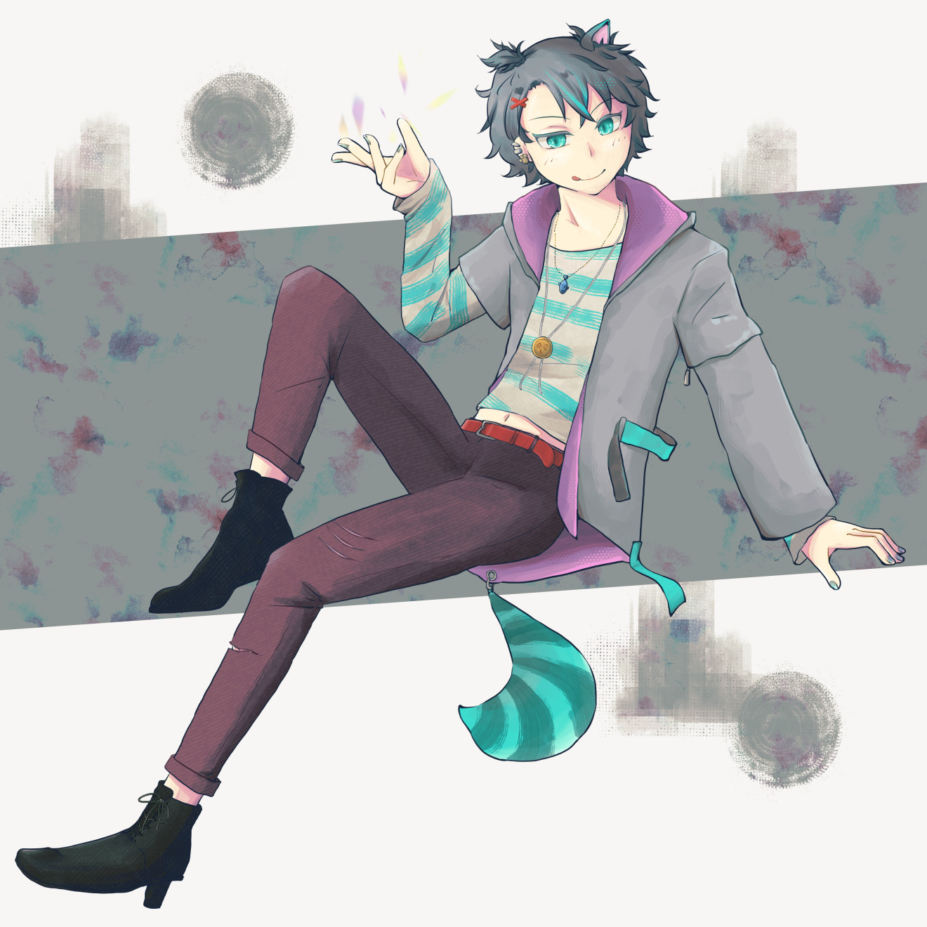 - 灰色、前髪に明るい青のメッシュ(耳はヘアピン)